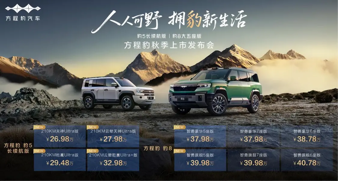 10月20日,方程豹汽車“豹5長續航版”煥新上市,價格26.98-32.98萬元;豹8大五座版加推上市,價格37.98-40.78萬元。本次方程豹豹系列產品,實現了DMO平臺的DMO+升級、華為乾崑智駕的ADS 4升級、以及比亞迪智慧生態等多項頂級核心科技的全面升級,并帶來續航、安全、舒適、操控等全維度的系統性優化。